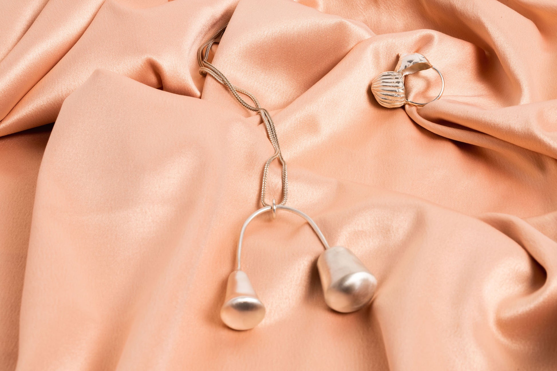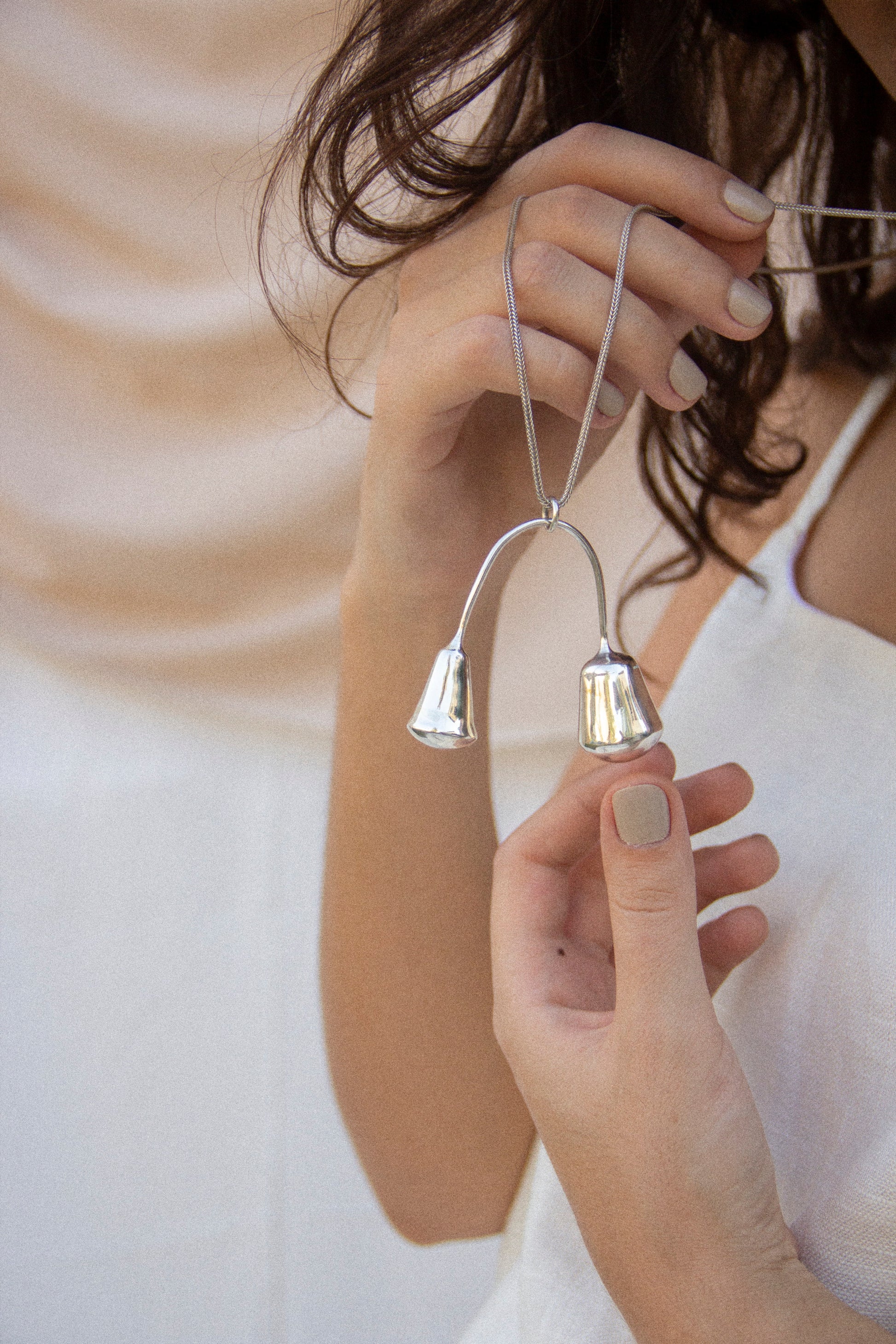 Taking inspiration from the Chain Balance Swing Earrings, this pendant is a subtle play of weight and movement with two asymmetrical minimal and contemporary forms balancing from a meticulous Roman Chain. A sweet pair of past and present, each of the two forms fit snug inside your palm, connecting you to the piece even more.