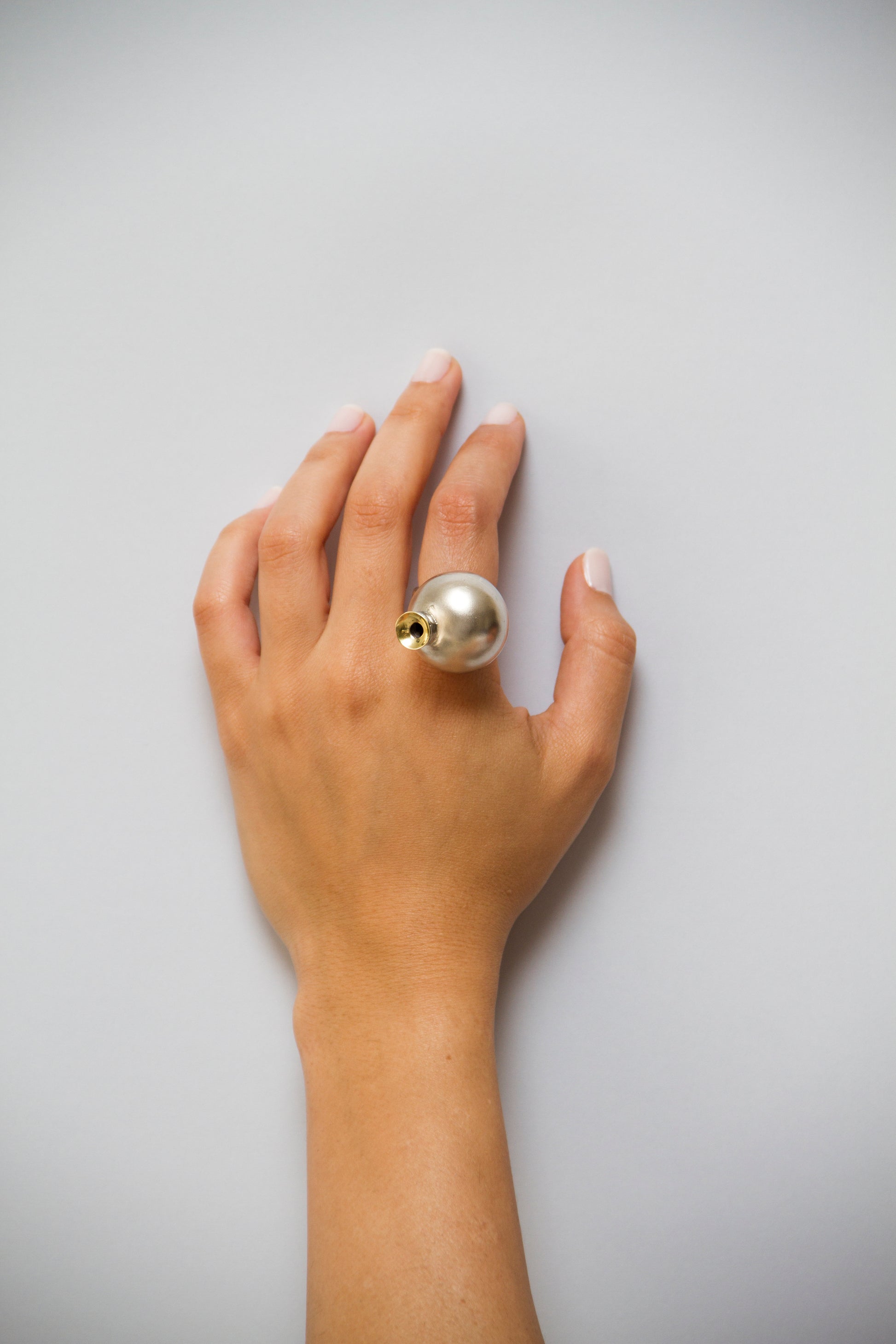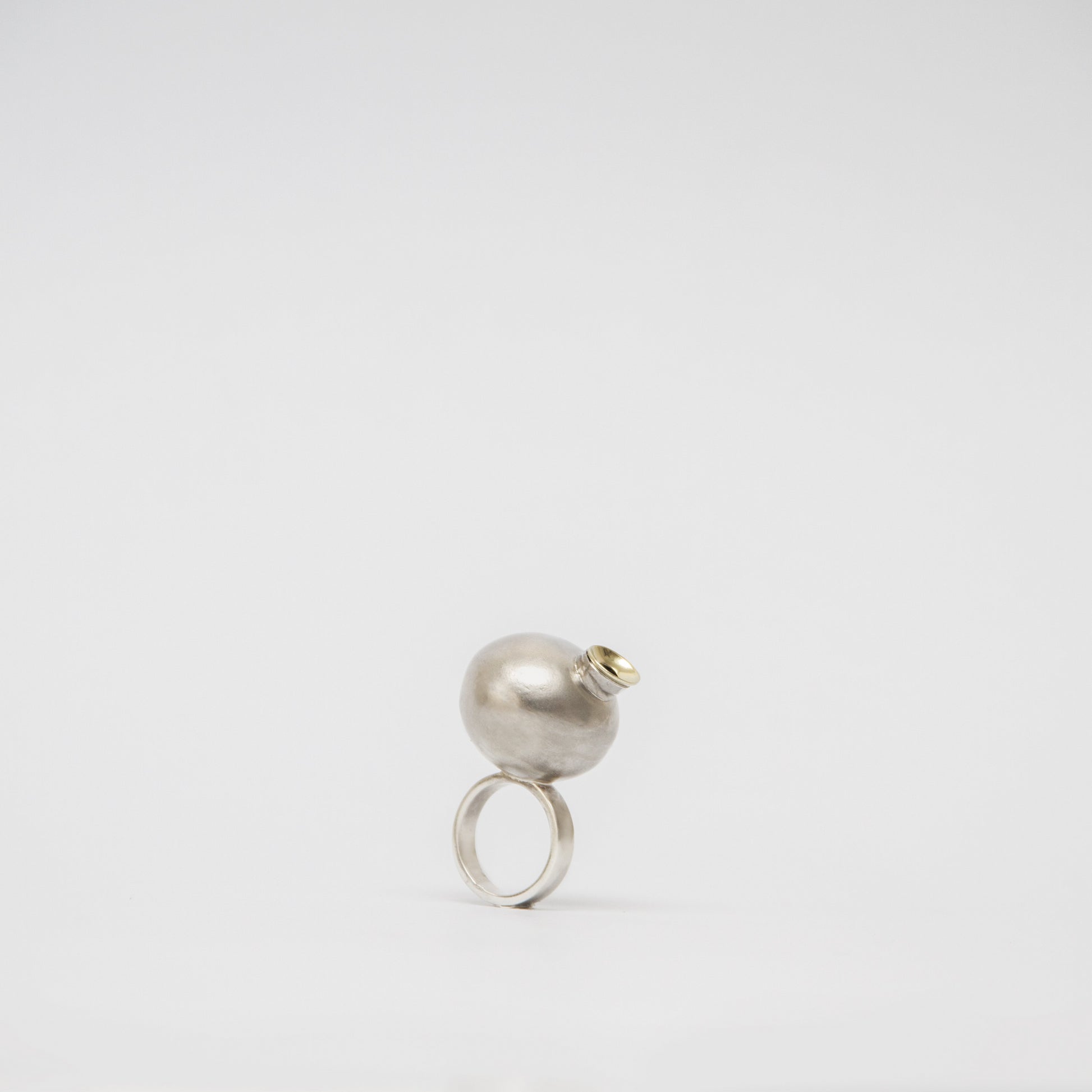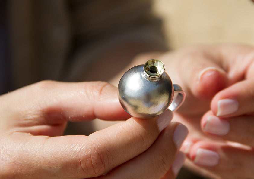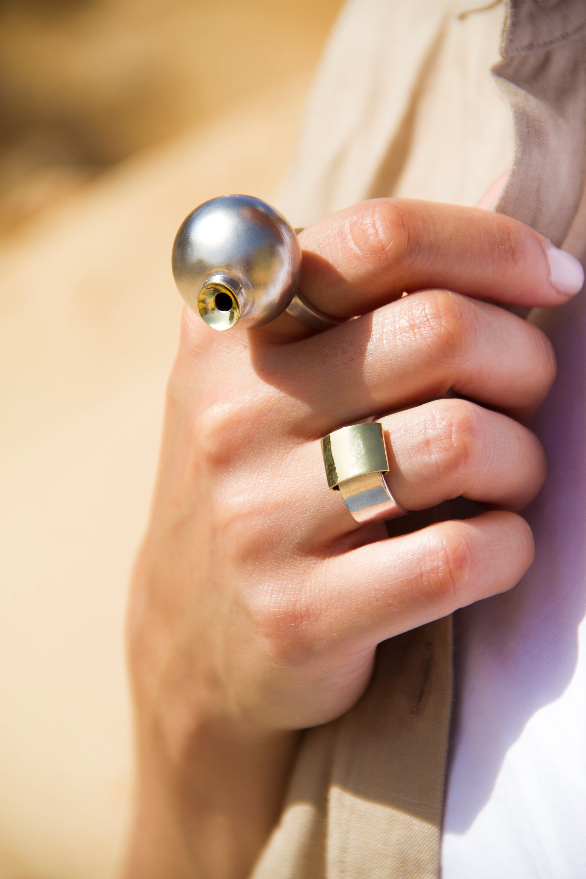 Completely unique in size, fabrication and methodology, no two pieces are alike. Turn heads while wearing this large orb container, and add a touch of 18K gold in the mouthpiece.