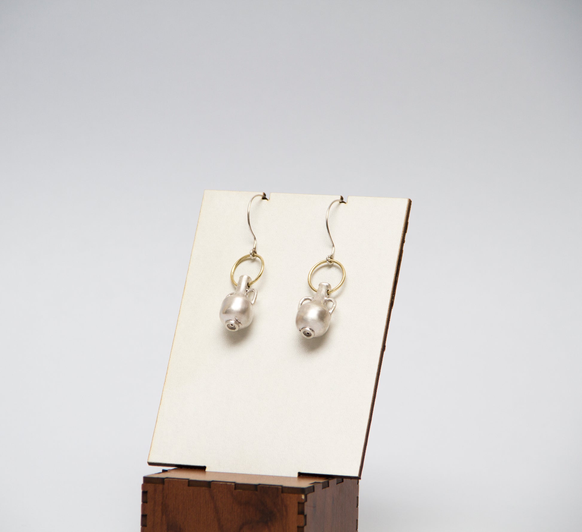 An ode to metalsmithing and pottery forms, this mini bottle container swings off the ear, playfully showing its open-top hollow nature.