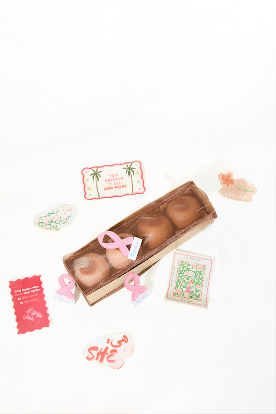 Created exclusively for the SHE Campaign’s Pink Pouch, each set helps raise awareness about breast cancer and contributes to funding early detection initiatives at Baheya Foundation.