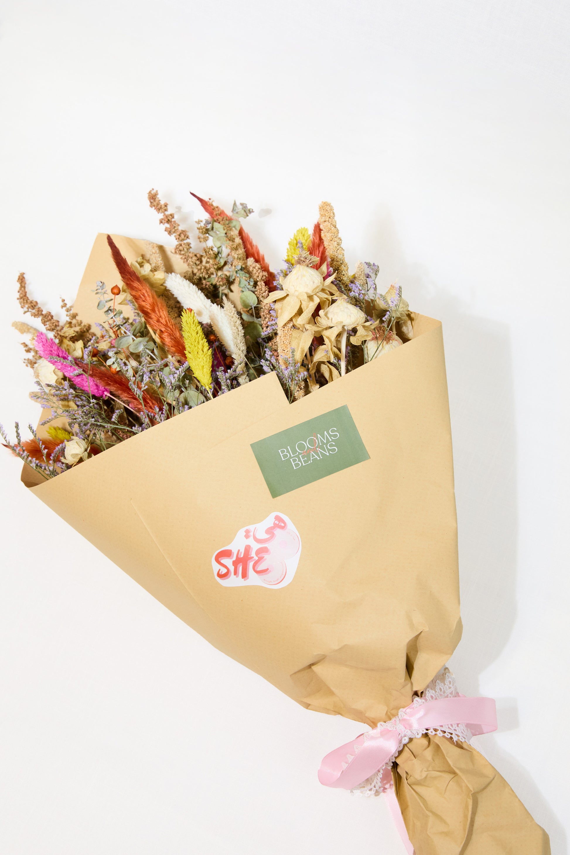 The SHE Blooms Flower Bouquet by Blooms and Beans is a hand-tied arrangement of dried flowers, carefully chosen to represent strength through stillness, softness through survival. Each stem, once vibrant and fresh, has been preserved, to carry forward a quiet kind of power. Like the journey of those facing breast cancer, these blooms speak of transformation, endurance, and grace beyond the seen.